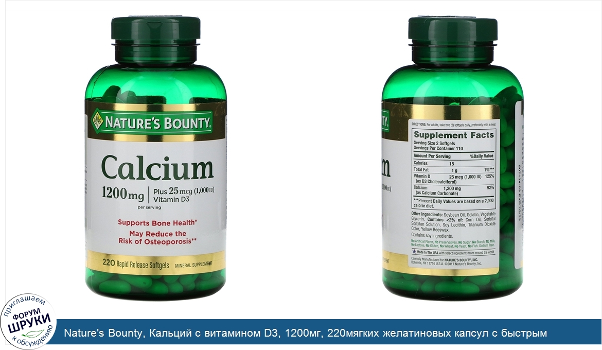 ru Nature's Bounty, Кальций с витамином D3, 1200мг, 220мягких желатиновых капсул с быстрым высвобождением действующего вещества