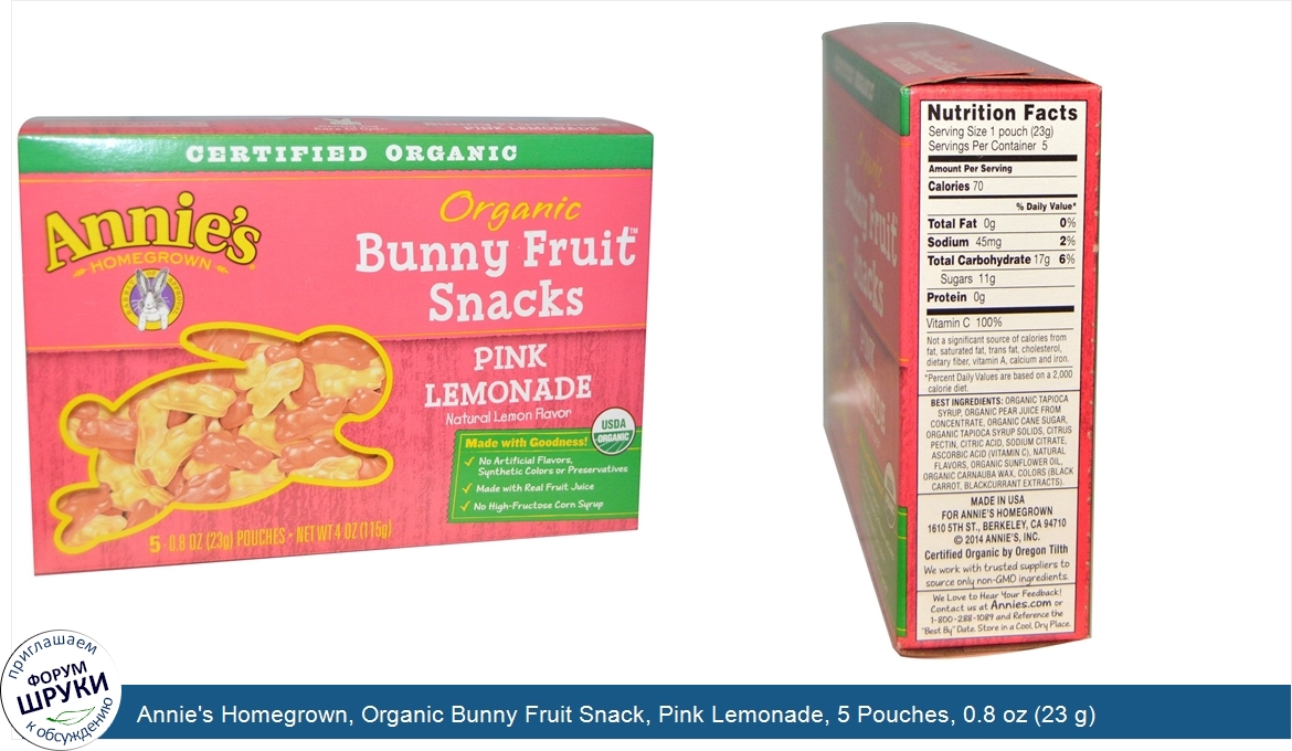 Друзья, если у вас есть отзыв/дополнение/комментарий/вопрос относительно Annie's Homegrown, Organic Bunny Fruit Snack, Pink Lemonade, 5 Pouches, 0.8 oz (23 g) - напишите его ответом в эту тему (это будет полезно всему сообществу в целом и вам в отдельности).