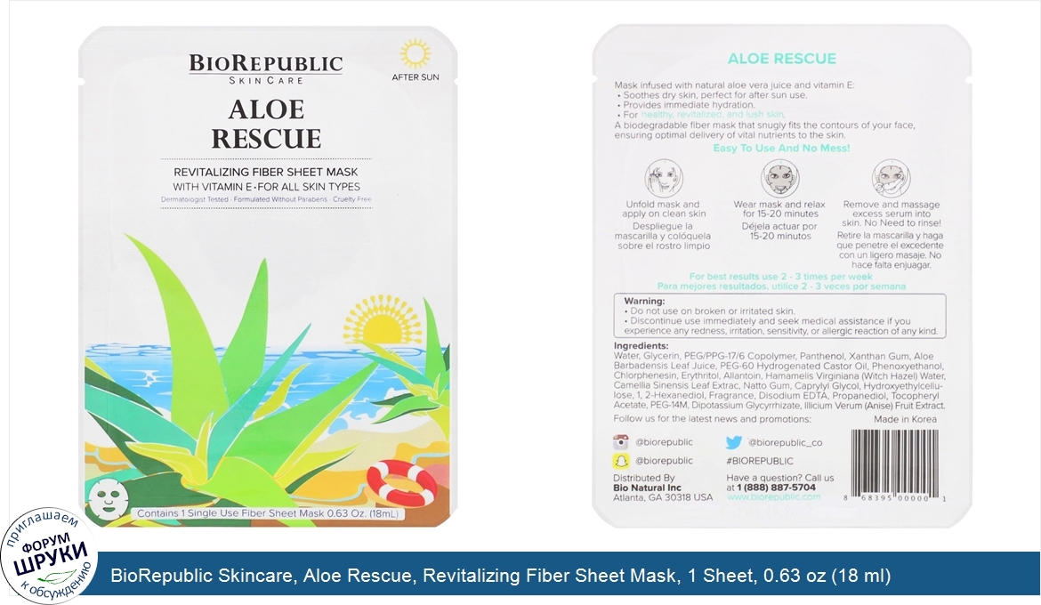 Друзья, если у вас есть отзыв/дополнение/комментарий/вопрос относительно BioRepublic Skincare, Aloe Rescue, Revitalizing Fiber Sheet Mask, 1 Sheet, 0.63 oz (18 ml) - напишите его ответом в эту тему (это будет полезно всему сообществу в целом и вам в отдельности).