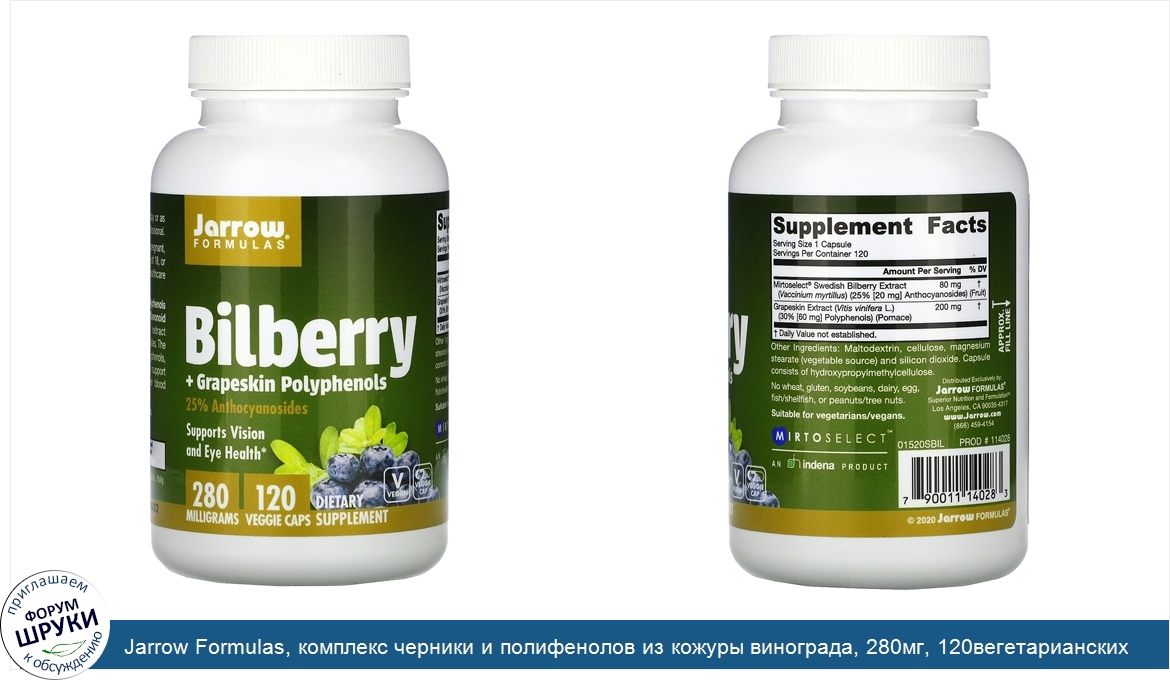 Jarrow Formulas, комплекс черники и полифенолов из кожуры винограда, 280мг, 120вегетарианских капсул