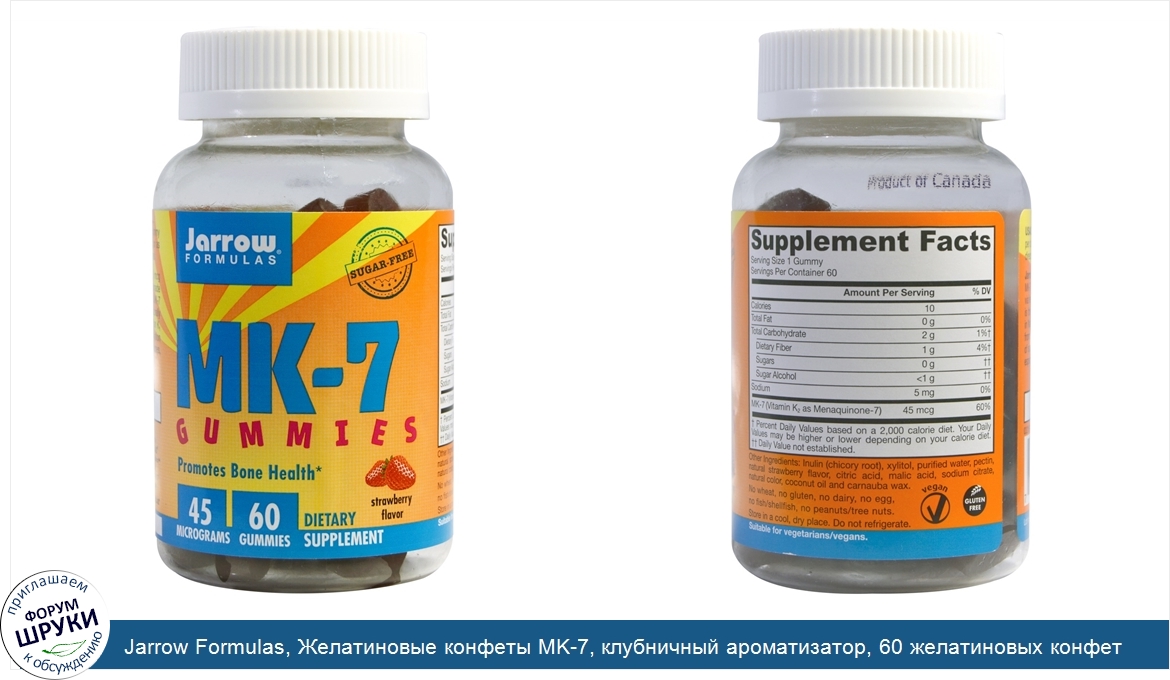 Sugar-Free. Promotes Bone Health. 45 Micrograms. Dietary Supplement. Vegan. Gluten-Free. Suitable for Vegetarians/Vegans. Jarrow Formulas MK-7 Gummies deliver 45 mcg MK-7 (Menaquinone-7) per gummy. This MK-7 is m...