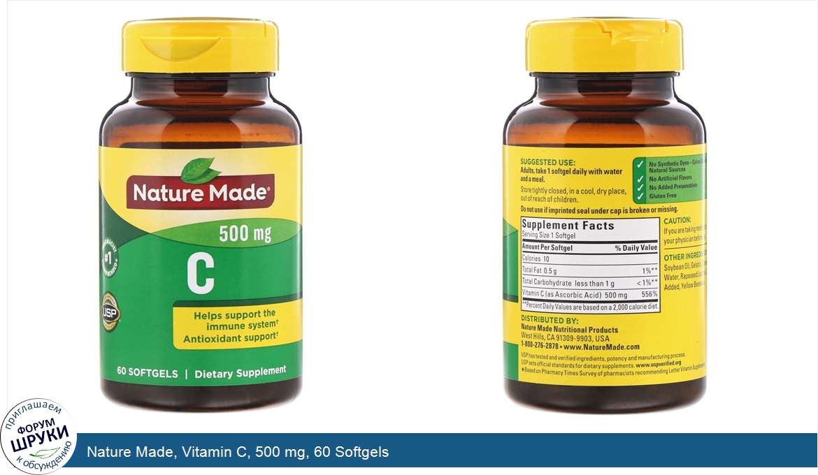 Друзья, если у вас есть отзыв/дополнение/комментарий/вопрос относительно Nature Made, Vitamin C, 500 mg, 60 Softgels - напишите его ответом в эту тему (это будет полезно всему сообществу в целом и вам в отдельности).