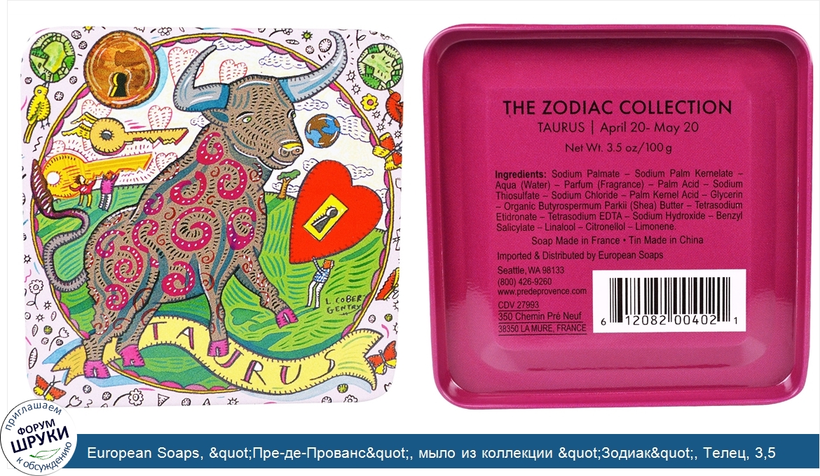 ru European Soaps, "Пре-де-Прованс", мыло из коллекции "Зодиак", Телец, 3,5 унции (100 г)