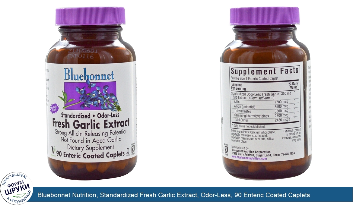 [DESCRIPT]No Garlic Breath. Strong Allicin Releasing Potential Not Found in Aged Garlic. Dietary Supplement. Vegetarian. Kosher Parve. Gluten Free. Bluebonnet’s Standardized Odor-Less Fresh Garlic Extract Enteric Coated Caplets provide 350 mg of fresh garlic extract from nature, premium-grade, non-GMO garlic bulbs containing potent alliin/allicin and sulfur compounds. Available in easy –to-swallow enteric coated caplets, which allow the garlic actives to bypass the stomach and dissolve in the intestines to avoid garlic breath and stomach upset.[/DESCRIPT]... (описание дополняется)