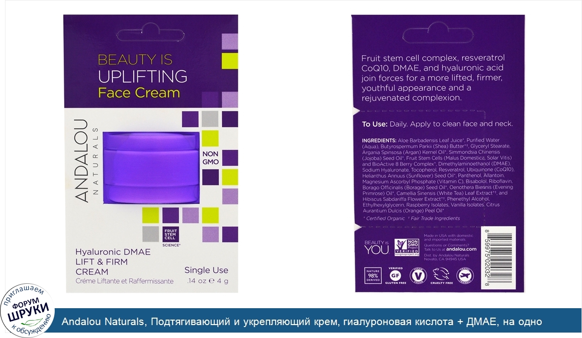 Друзья, если у вас есть отзыв/дополнение/комментарий/вопрос относительно Andalou Naturals, Подтягивающий и укрепляющий крем, гиалуроновая кислота + ДМАЕ, на одно применение, 0,14 унции (4 г) - напишите его ответом в эту тему (это будет полезно всему сообществу в целом и вам в отдельности).