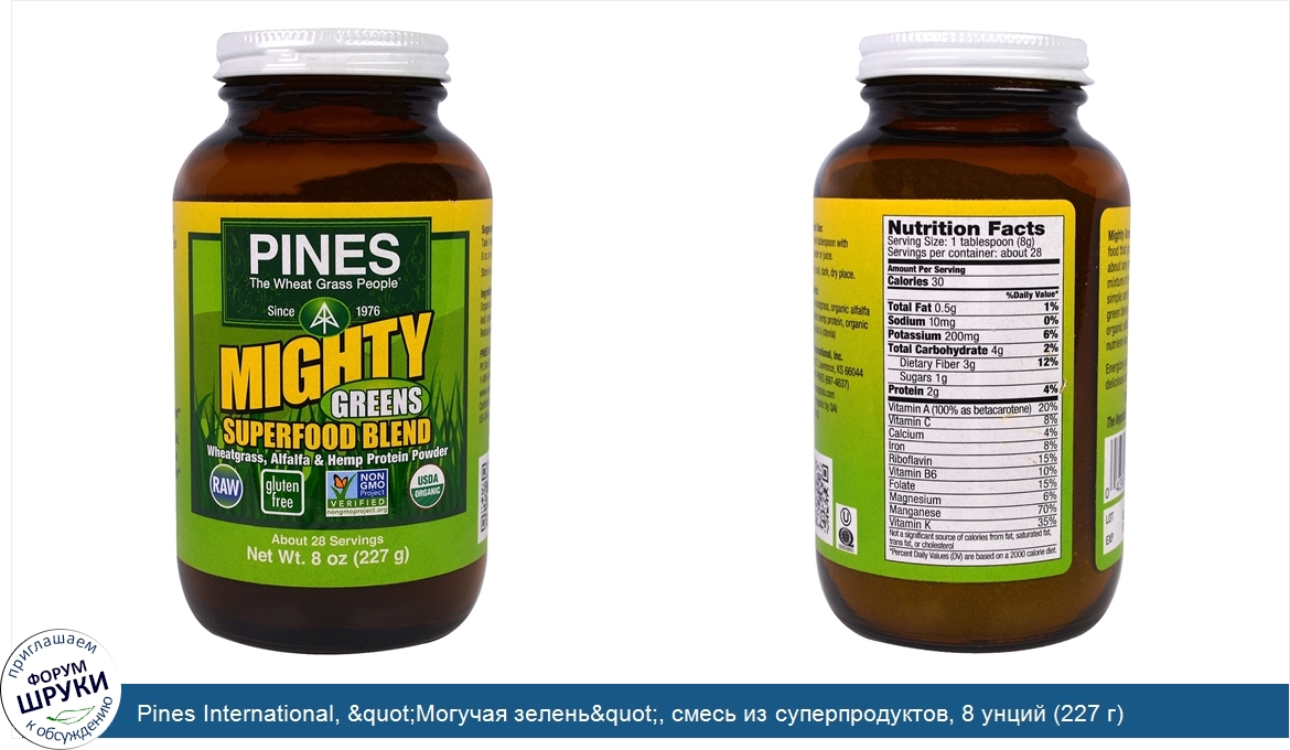 Друзья, если у вас есть отзыв/дополнение/комментарий/вопрос относительно Pines International, "Могучая зелень", смесь из суперпродуктов, 8 унций (227 г) - напишите его ответом в эту тему (это будет полезно всему сообществу в целом и вам в отдельности).