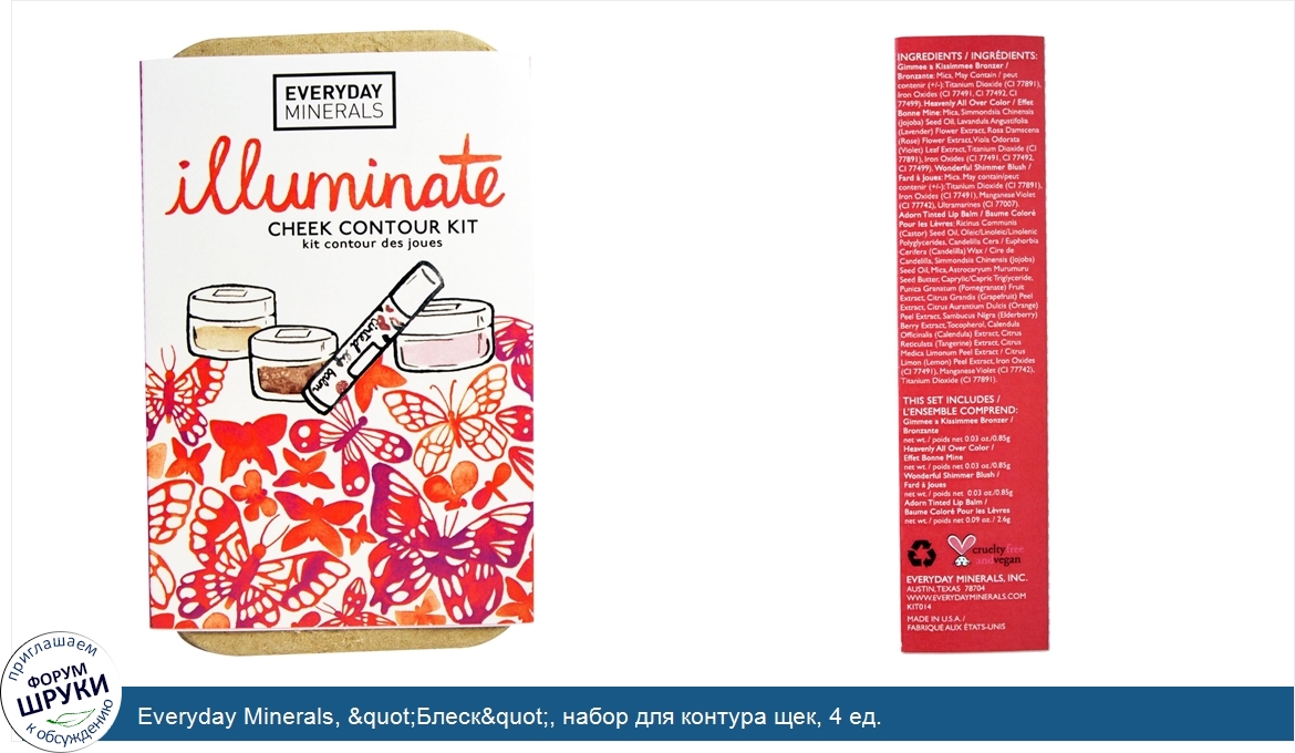 [DESCRIPT]Cruelty Free Vegan. Create the perfect cheek effects with our Illuminate Kit - a new all-natural collection of featherlight shades. The kit includes: a natural shimmer blush for a foolproof fresh face, a contouring bronzer for a year-round glowing look, and a petal pink blush for the perfect pick-me-up highlight. These luxurious shades not only go on smooth and feel great but keep your skin looking flawless! Each of these totally versatile shades are great for all occasions. This Set Includes:. Gimmee a kissimmee bronzer: net wt. 0.03 oz / 0.85 g. Heavenly all over color: net wt. 0.03 oz / 0.85. Wonderful shimmer blush: net wt. 0.03 oz / 0.85 g. Adorn tinted lip balm: 0.09 oz / 2.6 g.[/DESCRIPT]... (описание дополняется)