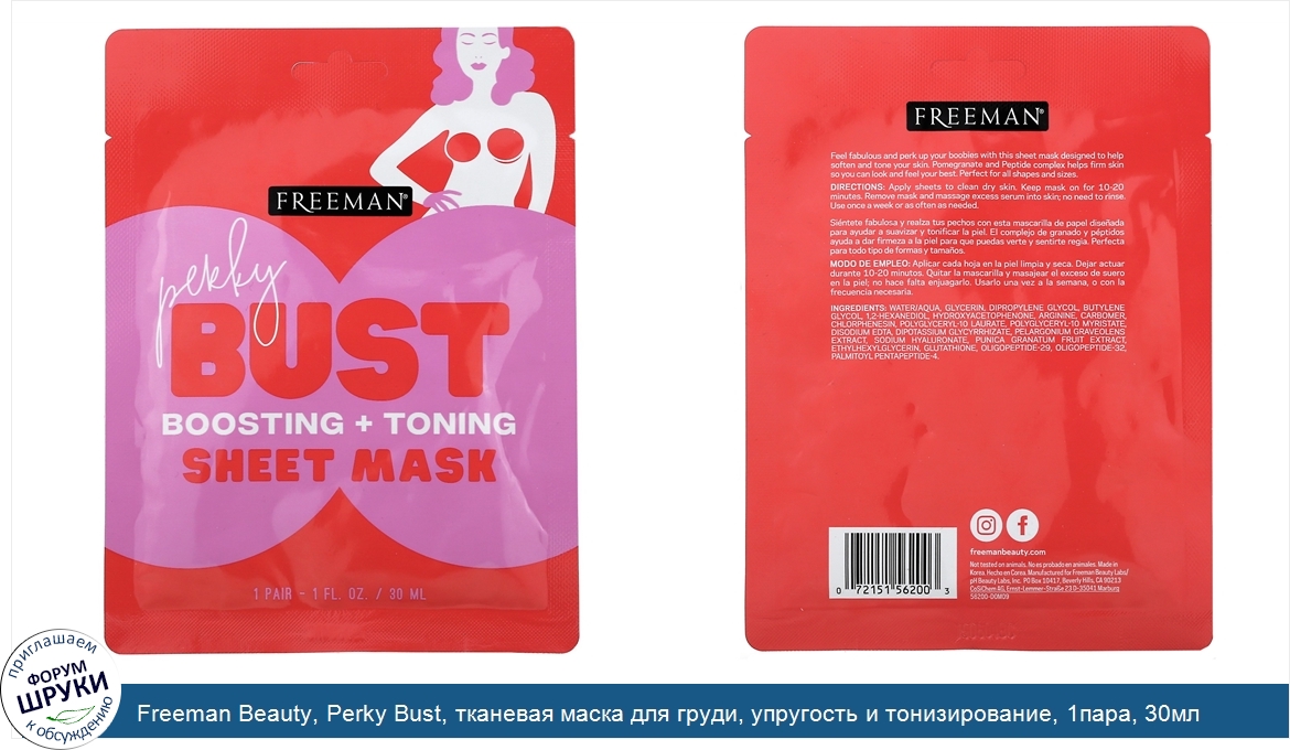 Freeman Beauty, Perky Bust, тканевая маска для груди, упругость и тонизирование, 1пара, 30мл (1жидк.унция)