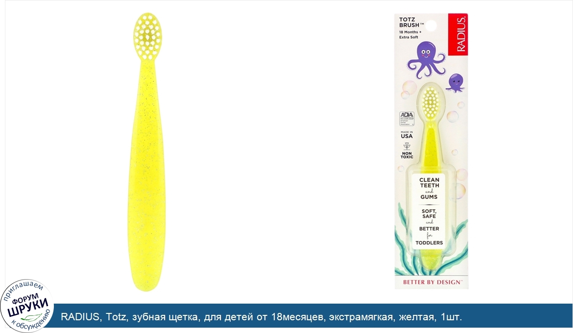 Друзья, если у вас есть отзыв/дополнение/комментарий/вопрос относительно RADIUS, Totz, зубная щетка, для детей от 18месяцев, экстрамягкая, желтая, 1шт. - напишите его ответом в эту тему (это будет полезно всему сообществу в целом и вам в отдельности).