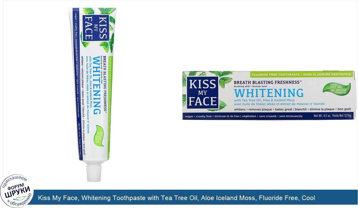 Kiss My Face, Whitening Toothpaste with Tea Tree Oil, Aloe Iceland Moss, Fluoride Free, Cool Mint Gel, 4.5 oz (127.6 g)