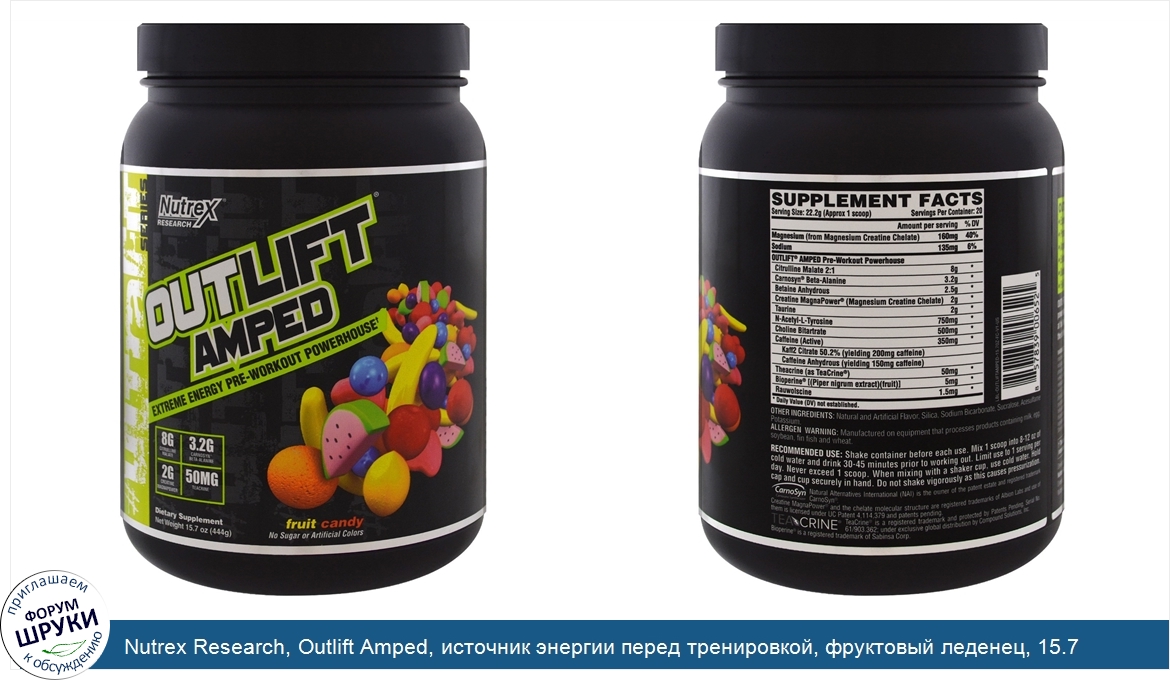 Nutrex Research, Outlift Amped, источник энергии перед тренировкой, фруктовый леденец, 15.7 унций (444 г)