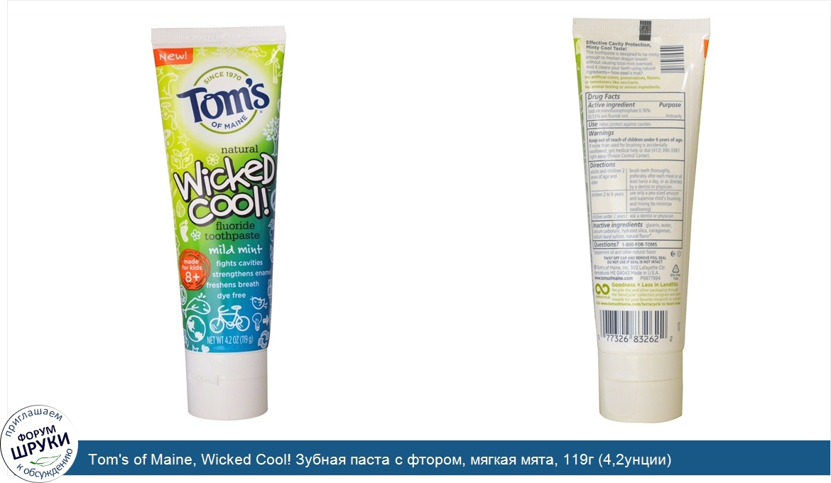Друзья, если у вас есть отзыв/дополнение/комментарий/вопрос относительно Tom's of Maine, Wicked Cool! Зубная паста с фтором, мягкая мята, 119г (4,2унции) - напишите его ответом в эту тему (это будет полезно всему сообществу в целом и вам в отдельности).
