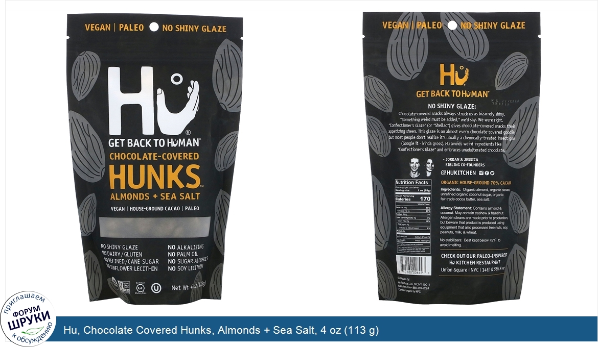 [DESCRIPT]Get Back to Human ®. Vegan. Organic House Ground 70% Cacao. Paleo. No Shiny Glaze. No Dairy / Certified Gluten Free. No Refined / Cane Sugar. No Sunflower Lecithin. No Alkalizing. No Palm Oil. No Sugar Alcohols. No Soy Lecithin. USDA Organic. Non GMO Project Verified. Kosher. Certified Organic by NFC. Chocolate-covered snacks always struck us as bizarrely shiny. "Something Weird must be added”, we’d say. We were right. “Confectioner’s Glaze” (or "shellac") gives chocolate-covered snacks their appetizing sheen. This glaze is on almost every chocolate-covered goodie, but most people don't realize it's usually a chemically-treated insect goo (Google it - kinda gross). Hu avoids weird ingredients like "confectioner's glaze" and embraces unadulterated chocolate. - Jordan Jessica. Sibling Co-founders[/DESCRIPT]... (описание дополняется)