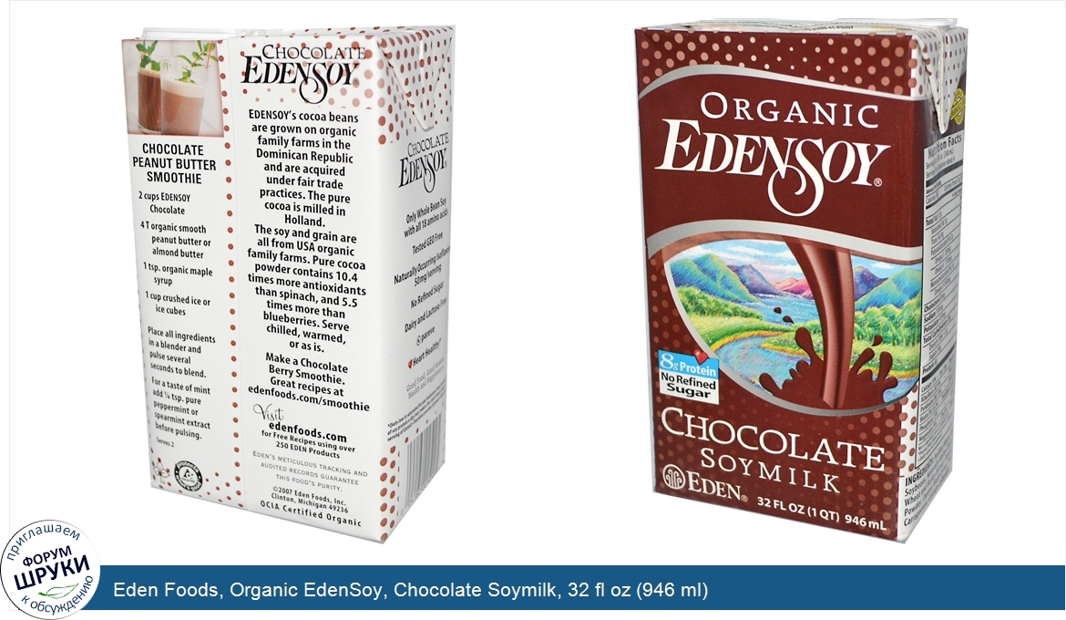 Друзья, если у вас есть отзыв/дополнение/комментарий/вопрос относительно Eden Foods, Organic EdenSoy, Chocolate Soymilk, 32 fl oz (946 ml) - напишите его ответом в эту тему (это будет полезно всему сообществу в целом и вам в отдельности).