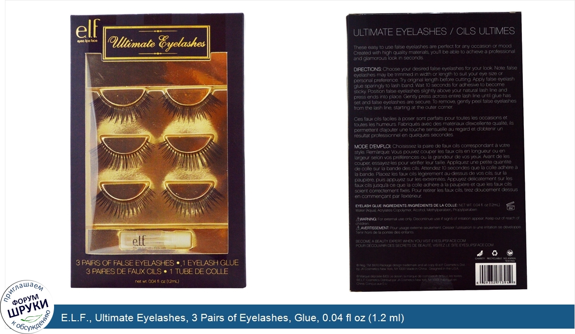 Друзья, если у вас есть отзыв/дополнение/комментарий/вопрос относительно E.L.F., Ultimate Eyelashes, 3 Pairs of Eyelashes, Glue, 0.04 fl oz (1.2 ml) - напишите его ответом в эту тему (это будет полезно всему сообществу в целом и вам в отдельности).