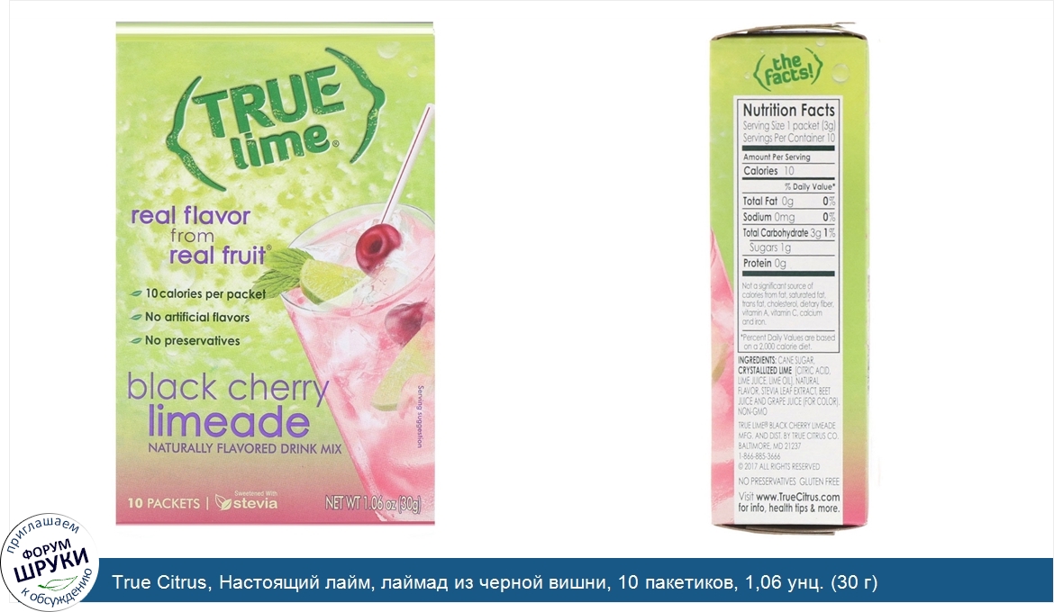 [DESCRIPT]Kosher Parve. Naturally Flavored Drink Mix. Real Flavor from Real Fruit. 10 Calories Per Packet. No Artificial Flavors. No Preservatives. Sweetened with Stevia. True Lime Black Cherry Limeade is 100% delicious because it's made with real lime juice and oils, sweetness from the Stevia leaf, the flavor of black cherries and simple ingredients that you can pronounce. Feel great about what you're drinking. Only 10 calories per packet. No preservatives or artificial flavors. Non-GMO. True Lime. Keeps you True.[/DESCRIPT]... (описание дополняется)