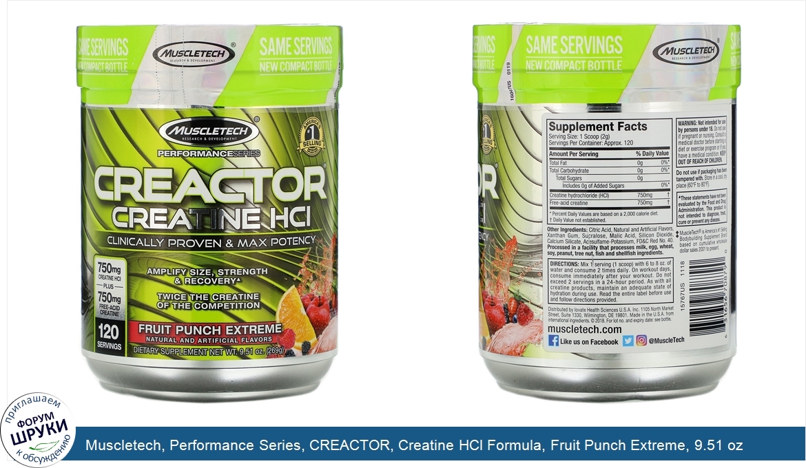 Друзья, если у вас есть отзыв/дополнение/комментарий/вопрос относительно Muscletech, Performance Series, CREACTOR, Creatine HCl Formula, Fruit Punch Extreme, 9.51 oz (269 g) - напишите его ответом в эту тему (это будет полезно всему сообществу в целом и вам в отдельности).