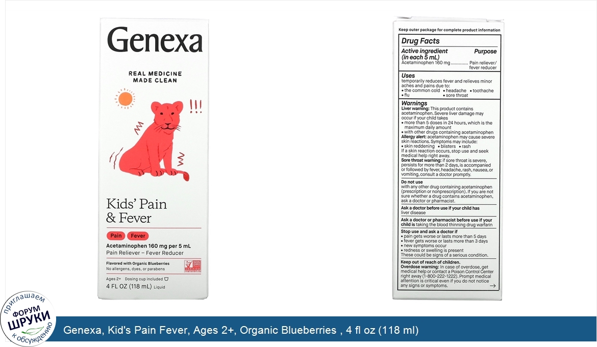 [DESCRIPT]Real Medicine Made Clean. Acetaminophen 160 mg Per 5 ml. Pain Reliever - Fever Reducer. No Allergens, Dyes, or Parabens. Dosing Cup Included. Liquid. Non GMO Project Verified. Certified B Corporation. Certified Gluten-Free. Certified Vegan. Only Ingredients People Deserve. Acetaminophen. Organic Agave Syrup. Organic Blueberry Flavor. Citrus Extract. Non-GMO Flavor. Purified Water. And that's all. Give it a shake! We use clean ingredients so it's normal for them to separate and change color over time. Uses. :. Temporarily reduces fever and relieves minor aches and pains due to:. The common cold. Flu. Headache. Sore Throat. Toothache. People over Everything. We think you should feel good about what makes you feel better. That's why we make medicine with the same active ingredients you need, but without the artificial ones you don't. It's what people deserve.[/DESCRIPT]... (описание дополняется)