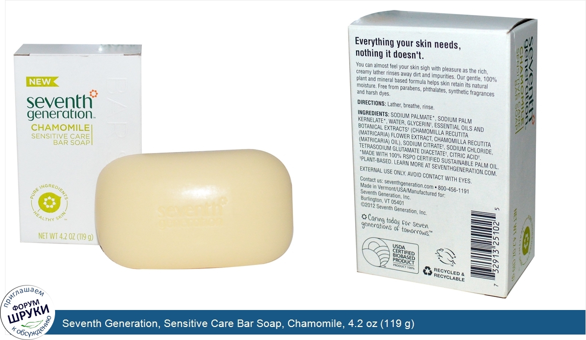 Друзья, если у вас есть отзыв/дополнение/комментарий/вопрос относительно Seventh Generation, Sensitive Care Bar Soap, Chamomile, 4.2 oz (119 g) - напишите его ответом в эту тему (это будет полезно всему сообществу в целом и вам в отдельности).