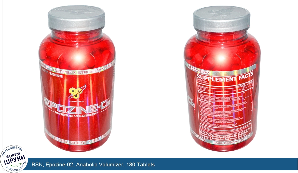 Друзья, если у вас есть отзыв/дополнение/комментарий/вопрос относительно BSN, Epozine-02, Anabolic Volumizer, 180 Tablets - напишите его ответом в эту тему (это будет полезно всему сообществу в целом и вам в отдельности).
