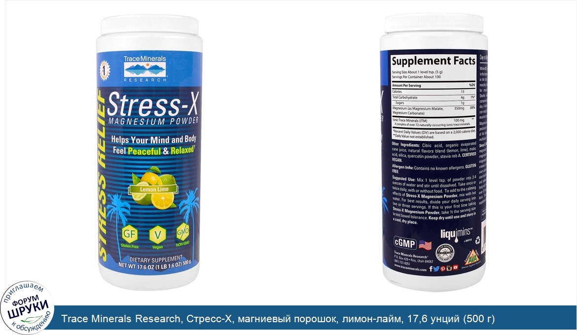 [DESCRIPT]America's #1 Trace Mineral Brand. Helps Your Mind and Body Feel Peaceful Relaxed. Gluten Free. Vegan. Non-GMO. Dietary Supplement. cGMP. LiquiMins. Certified Vegan. Day or Nighttime Stress Relief Powder. While 60% of magnesium in the body is found in the bones and teeth, 40% of the magnesium in the body is found in the muscles. In the muscles, magnesium is primarily responsible for muscle relaxation after contraction. Studies indicate that 68% of US adults consume less than the RDA of magnesium per day. A deficiency of magnesium in the body can result in a myriad of problems, including muscle cramps and nerve irritability. Magnesium is also the second-most plentiful positively charged ion found within the cells of the body, signifying its importance in a multitude of physiological cellular functions. Stress-X Magnesium Powder. is a natural magnesium supplement formulated with magnesium malate and a special blend of magnesium carbonate and citric acid, which creates a highly absorbable form of magnesium citrate to help maintain healthy magnesium levels in the body to help you stay calm and relaxed and to feel overall wellness in body and mind. We also added a complex of over 72 naturally-occurring electrolytes from Ionic Trace Minerals for a magnesium supplement that is unmatched in the industry.[/DESCRIPT]... (описание дополняется)