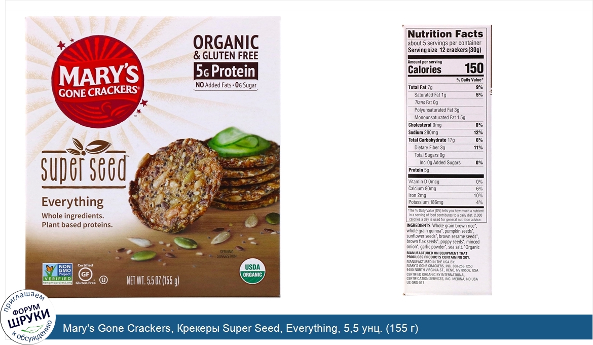 [DESCRIPT]Conscious Eating. For The Health of Body, Mind and Planet. Organic Gluten Free. 5 g Protein. No Added Fats - 0 g Sugar. Whole Ingredients. Plant Based Proteins. Non GMO Project Verified. Certified Gluten Free. Kosher. USDA Organic. Certified Organic by International Certification Services, Inc. 100% Whole Grain - 18 g or More Per Serving. Certified Vegan. Packed with seeds. Loaded with nutrition. Imagine one cracker giving you the protein and carbs you need, plus the essential fats that are, well, essential to helping you feel vital best. Now that's abundant goodness for you! Savor the rich, indulgent taste of luscious sunflower and pumpkin seeds, organically grown whole grains, and inspired flavors that could only come from Mary's. Mary's recipe for happiness: whole foods for a full life. We put a lot of heart into what we do. Now we put a lot of seeds into it too! When we saw how much you liked our Super Seed crackers, we asked ourselves: "How many luscious flavors of our exSEEDingly seeded crackers can we create?" Putting moderation on the back burner, we hit the kitchen with a mission. The result: Mary's Super Seed line, an extended family of surprisingly indulgent crackers for all who like a little extra. Packed with seeds and essential fats, our Super Seed crackers bring new flavors and abundant goodness to your delicious life! Peace, Love Crunch. Mary.[/DESCRIPT]... (описание дополняется)