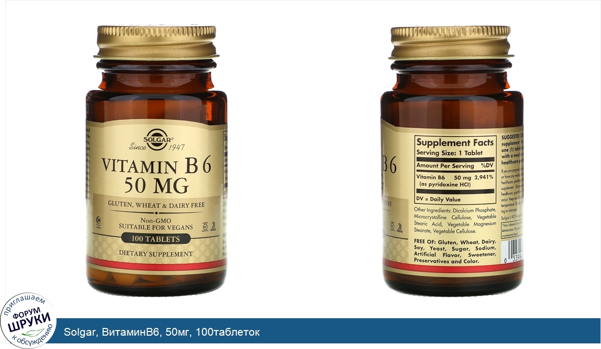 Друзья, если у вас есть отзыв/дополнение/комментарий/вопрос относительно Solgar, ВитаминВ6, 50мг, 100таблеток - напишите его ответом в эту тему (это будет полезно всему сообществу в целом и вам в отдельности).