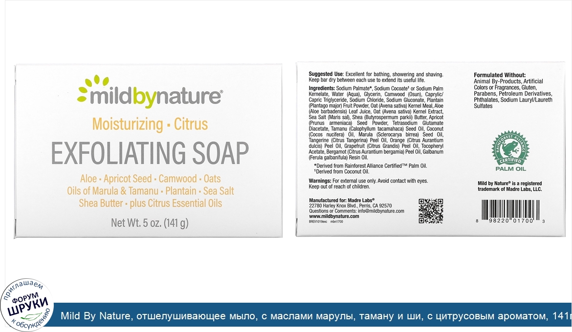 Друзья, если у вас есть отзыв/дополнение/комментарий/вопрос относительно Mild By Nature, отшелушивающее мыло, с маслами марулы, таману и ши, с цитрусовым ароматом, 141г (5унций) - напишите его ответом в эту тему (это будет полезно всему сообществу в целом и вам в отдельности).