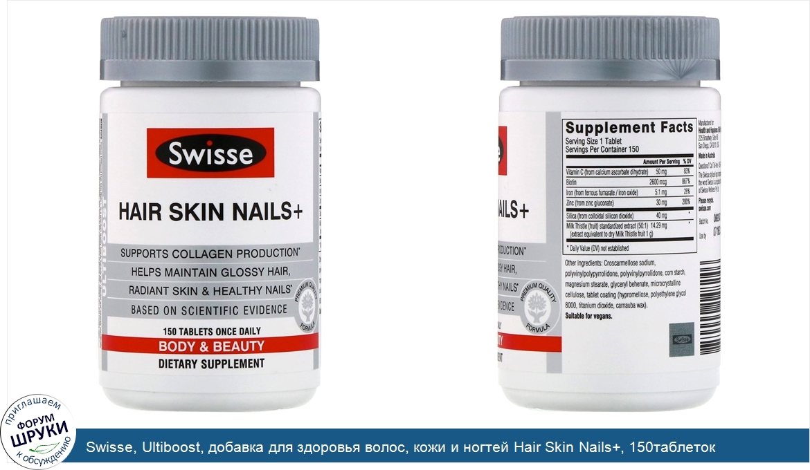 Друзья, если у вас есть отзыв/дополнение/комментарий/вопрос относительно Swisse, Ultiboost, добавка для здоровья волос, кожи и ногтей Hair Skin Nails+, 150таблеток - напишите его ответом в эту тему (это будет полезно всему сообществу в целом и вам в отдельности).