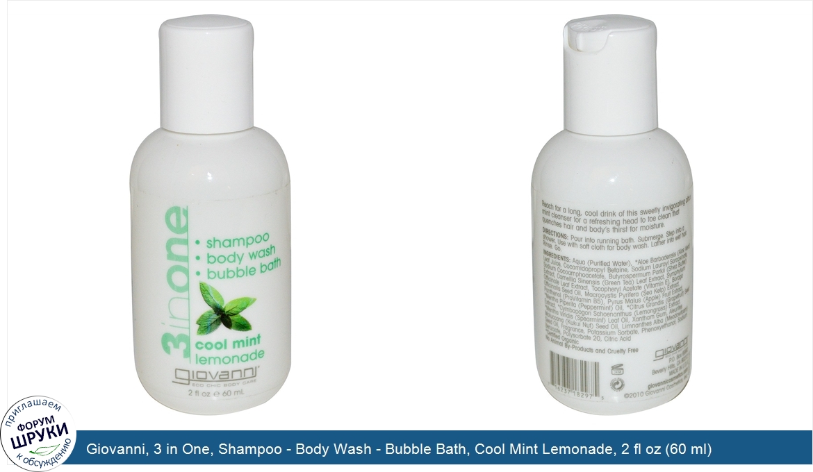 Друзья, если у вас есть отзыв/дополнение/комментарий/вопрос относительно Giovanni, 3 in One, Shampoo - Body Wash - Bubble Bath, Cool Mint Lemonade, 2 fl oz (60 ml) - напишите его ответом в эту тему (это будет полезно всему сообществу в целом и вам в отдельности).