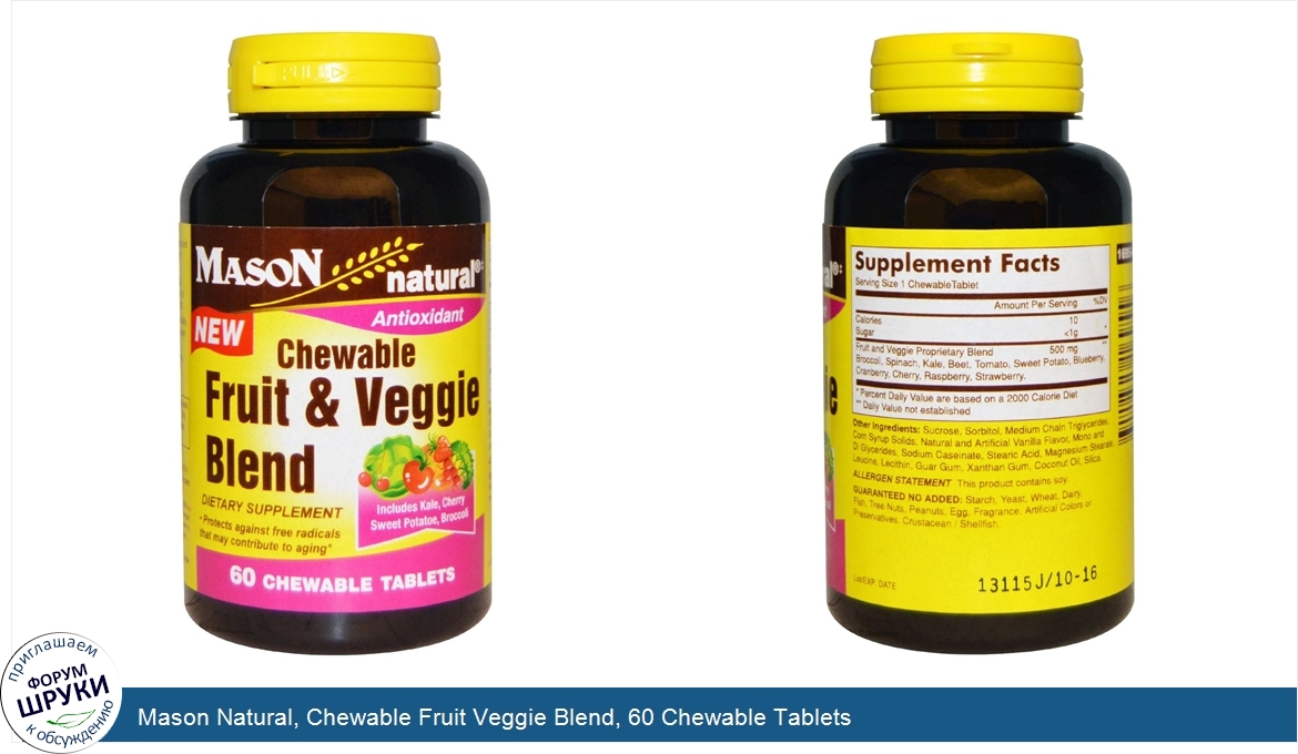 Друзья, если у вас есть отзыв/дополнение/комментарий/вопрос относительно Mason Natural, Chewable Fruit Veggie Blend, 60 Chewable Tablets - напишите его ответом в эту тему (это будет полезно всему сообществу в целом и вам в отдельности).