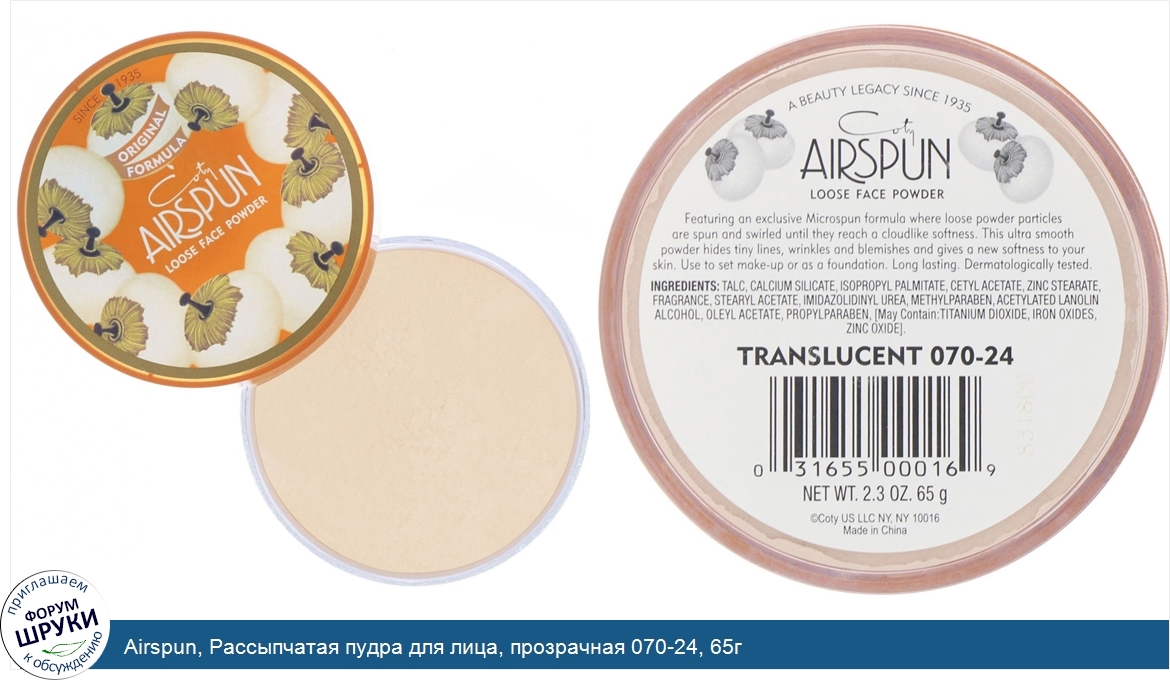 Друзья, если у вас есть отзыв/дополнение/комментарий/вопрос относительно Airspun, Рассыпчатая пудра для лица, прозрачная 070-24, 65г - напишите его ответом в эту тему (это будет полезно всему сообществу в целом и вам в отдельности).