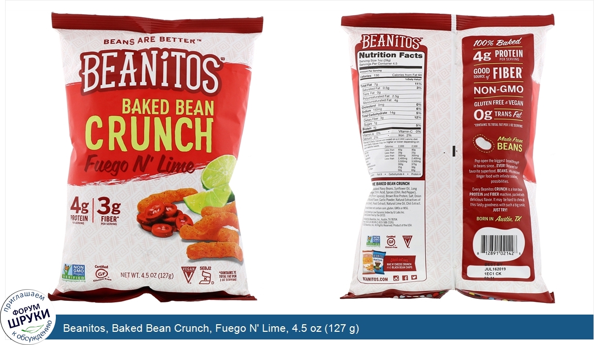 Друзья, если у вас есть отзыв/дополнение/комментарий/вопрос относительно Beanitos, Baked Bean Crunch, Fuego N' Lime, 4.5 oz (127 g) - напишите его ответом в эту тему (это будет полезно всему сообществу в целом и вам в отдельности).