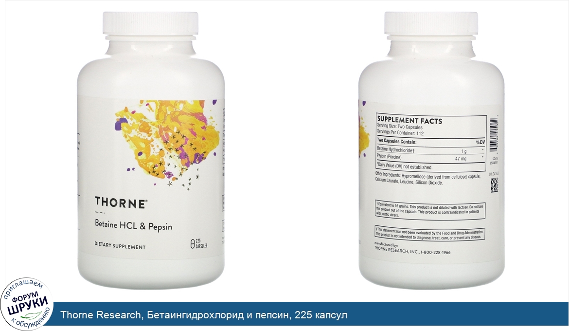Друзья, если у вас есть отзыв/дополнение/комментарий/вопрос относительно Thorne Research, Бетаингидрохлорид и пепсин, 225 капсул - напишите его ответом в эту тему (это будет полезно всему сообществу в целом и вам в отдельности).