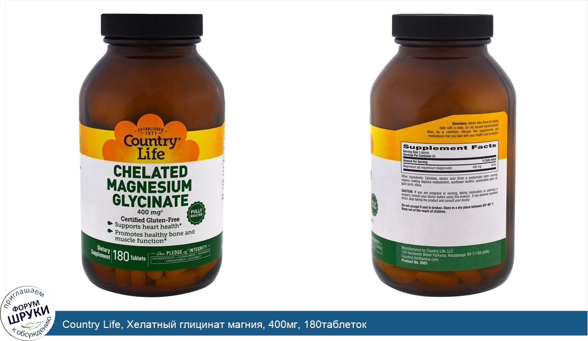 Друзья, если у вас есть отзыв/дополнение/комментарий/вопрос относительно Country Life, Хелатный глицинат магния, 400мг, 180таблеток - напишите его ответом в эту тему (это будет полезно всему сообществу в целом и вам в отдельности).