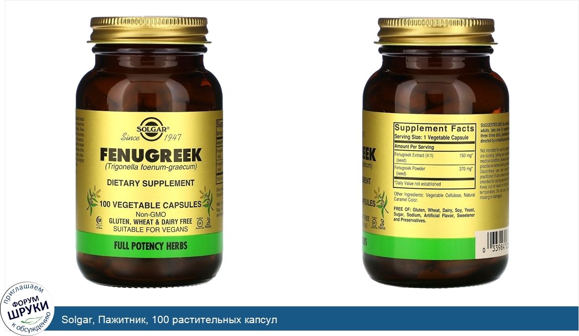 Друзья, если у вас есть отзыв/дополнение/комментарий/вопрос относительно Solgar, Пажитник, 100 растительных капсул - напишите его ответом в эту тему (это будет полезно всему сообществу в целом и вам в отдельности).