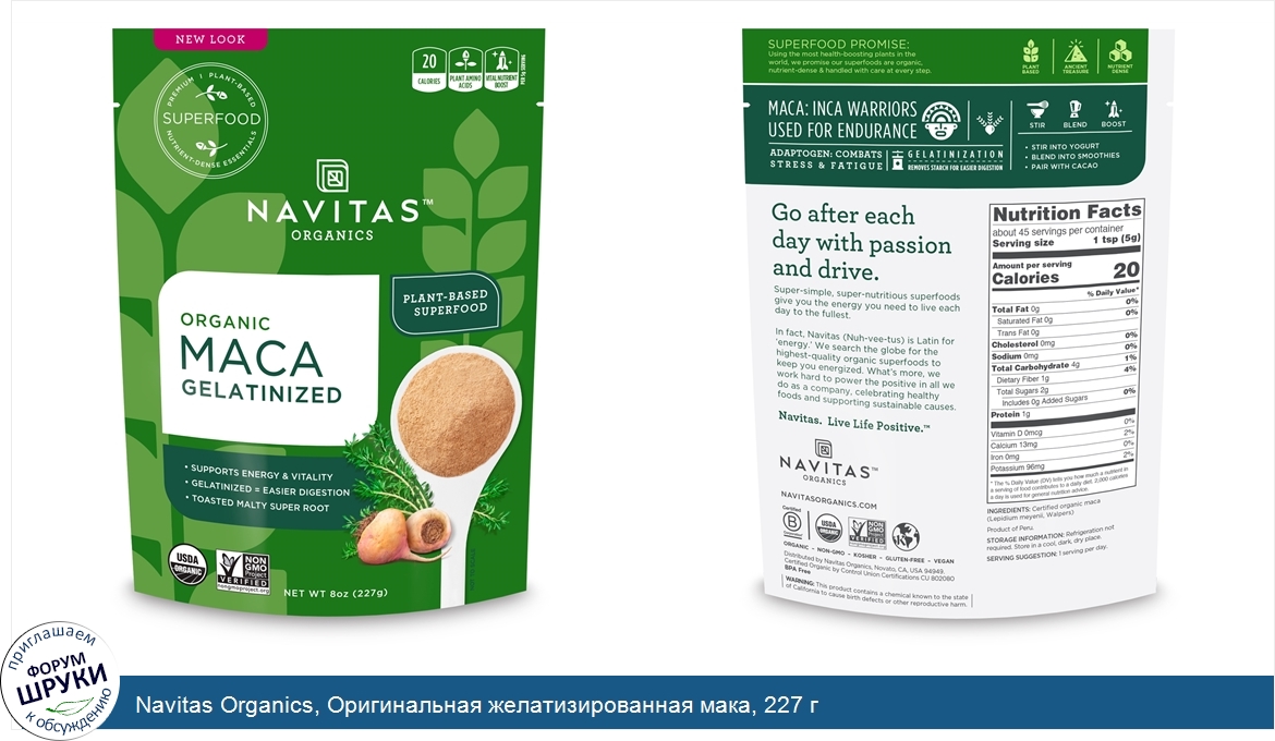 [DESCRIPT]Premium | Plant-Based Superfood. Nutrient-Dense Essentials. 20 Calories / Plant Amino Acids / Vital Nutrient Boost – Per 5 g Serving. Supports Energy Vitality. Gelatinized = Easier Digestion. Toasted Malty Super Root. USDA Organic. Non-GMO Project Verified. Ancient Treasure. B Corporation Certified. Kosher. Gluten Free. Vegan. Certified Organic By Control Union Certifications. BPA Free. Positive Mind - Positive Vibes - Positive Life. Superfood Promise: Using the most health-boosting plants in the world, we promise our superfoods are organic, nutrient dense handled with care at every step. Maca: Inca Warriors Used for Endurance. Adaptogen: Combats Stress Fatigue. Gelatinization - Removes Starch for Easier Digestion. Go after each day with passion and drive. Super-simple, super-nutritious superfoods give you the energy you need to live each day to the fullest. In fact, Navitas (Nuh-vee-tus) is Latin for 'energy'. We search the globe for the highest-quality organic superfoods to keep you energized. What's more, we work hard to power the positive in all we do as a company, celebrating healthy foods and supporting sustainable causes. Navitas. Live Life Positive.[/DESCRIPT]... (описание дополняется)