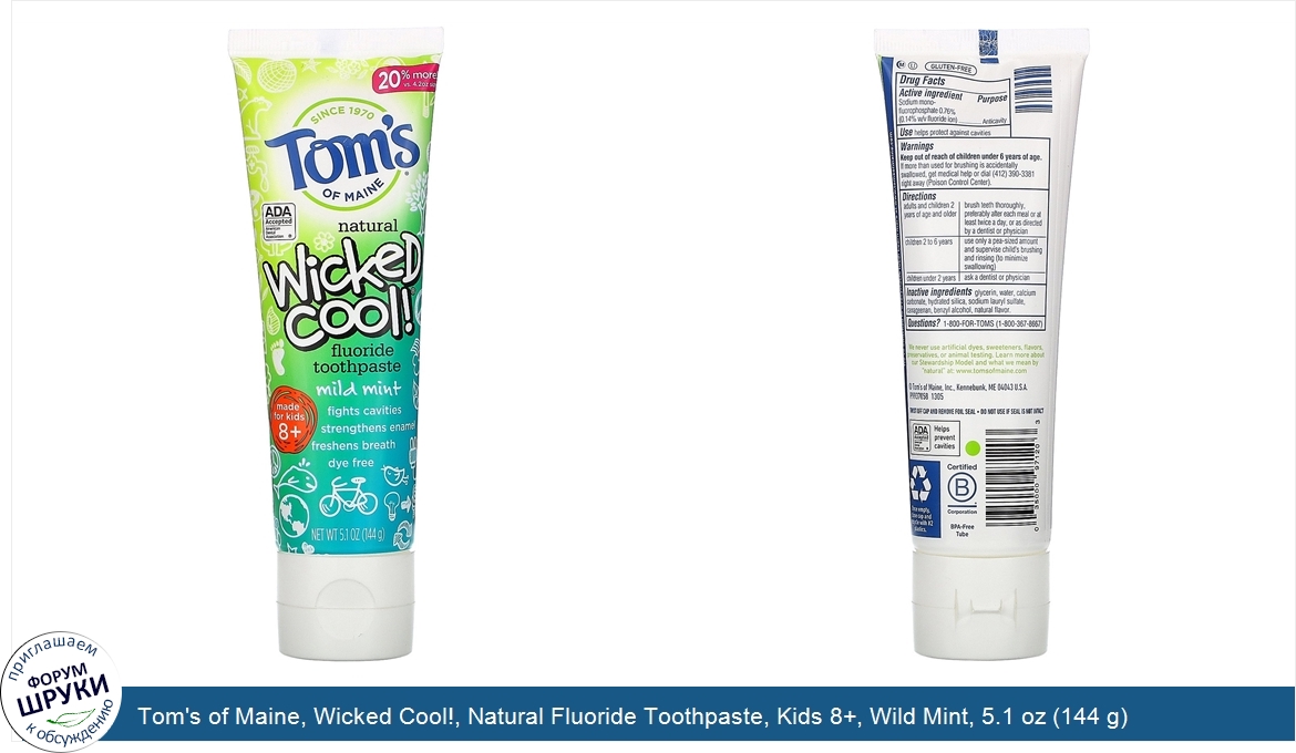 Друзья, если у вас есть отзыв/дополнение/комментарий/вопрос относительно Tom's of Maine, Wicked Cool!, Natural Fluoride Toothpaste, Kids 8+, Wild Mint, 5.1 oz (144 g) - напишите его ответом в эту тему (это будет полезно всему сообществу в целом и вам в отдельности).