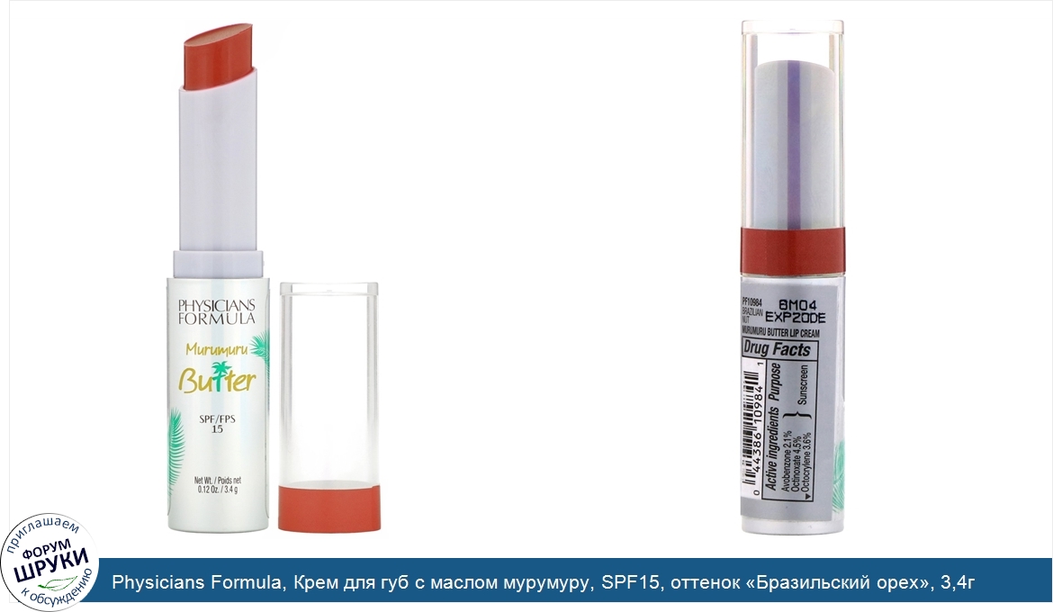 ru Physicians Formula, Крем для губ с маслом мурумуру, SPF15, оттенок «Бразильский орех», 3,4г