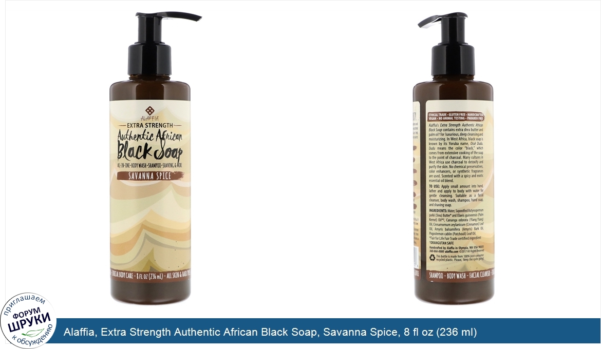 [DESCRIPT]All-in-1. Body Wash | Shampoo | Shaving More. Facial Cleanser - Ethical Body Care - All Skin Hair Types - Hand Soap - Safe Gentle. Ethical Trade. Gluten Free. Handcrafted. Vegan. No Animal Testing. Paraben Free. Alaffia's Extra Strength Authentic African Black Soap contains extra shea butter and palm oil† for luxurious, deep cleansing and moisturizing. In West Africa, black soap is known by its Yoruba name, Osse Dudu. Dudu means the color "black," which comes from extensive cooking of the soap to the point of charcoal. Many cultures in West Africa use charcoal to detoxify and purify the skin. No chemical preservatives, color enhancers, or synthetic fragrances are used. Scented with a spicy and exotic essential oil blend.[/DESCRIPT]... (описание дополняется)