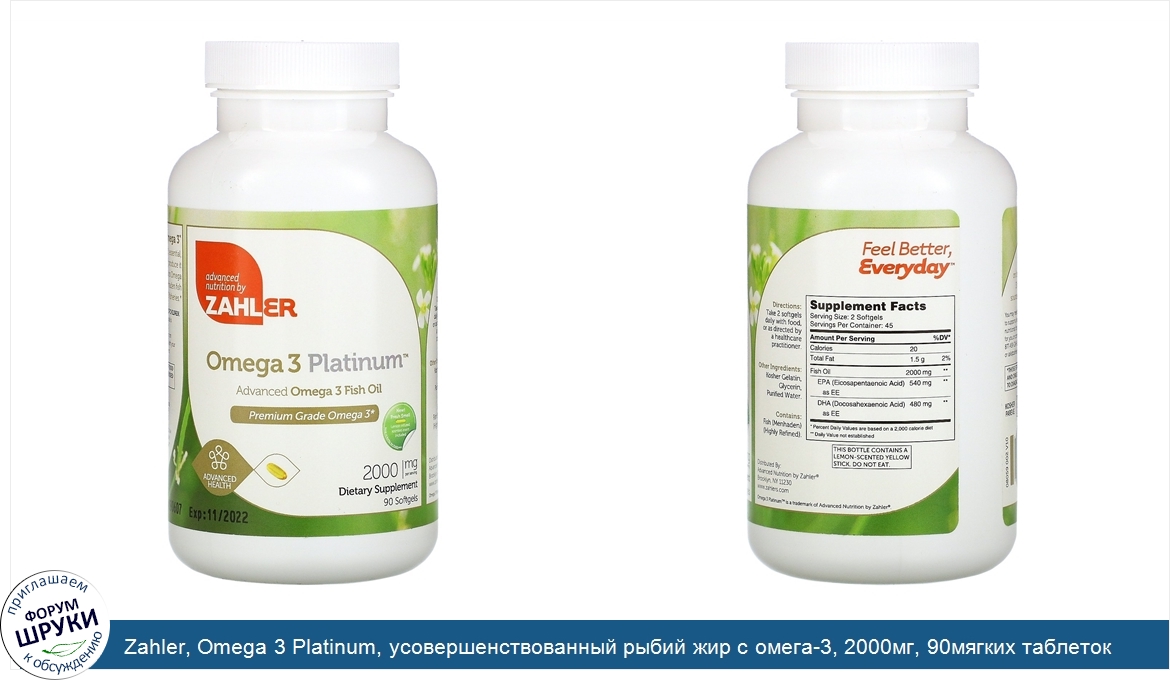 [DESCRIPT]Advanced Nutrition by Zahler. Advanced Omega 3 Fish Oil. Premium Grade Omega-3. Advanced Health. Dietary Supplement. Feel Better, Everyday. ™. Kosher Pareve. Non-GMO. Gluten Free. Dairy Free. Soy Free. Premium Grade Omega 3. Omega 3 is an essential fatty acid; essential, because the body requires it but cannot produce it on its own. Zahler Omega 3 Platinum. ™. contains Omega 3 fatty acids derived from wild-caught Menhaden fish sourced from certified, sustainably managed US fisheries.[/DESCRIPT]... (описание дополняется)
