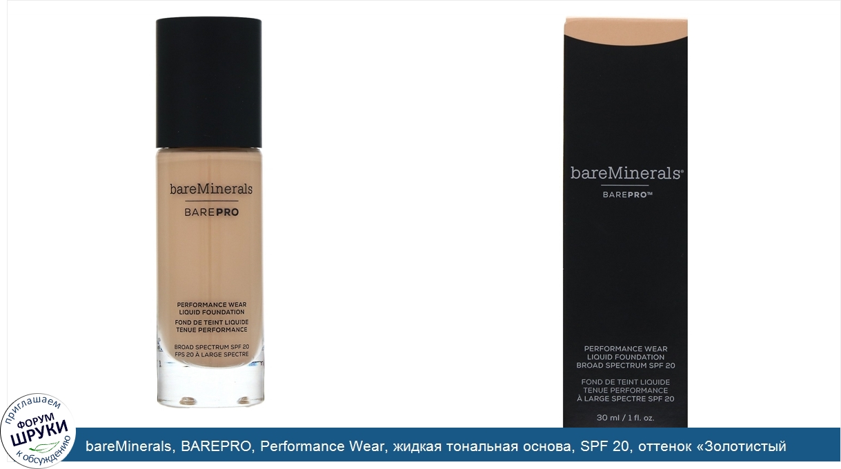 bareMinerals, BAREPRO, Performance Wear, жидкая тональная основа, SPF 20, оттенок «Золотистый нюдовый 13», 30мл