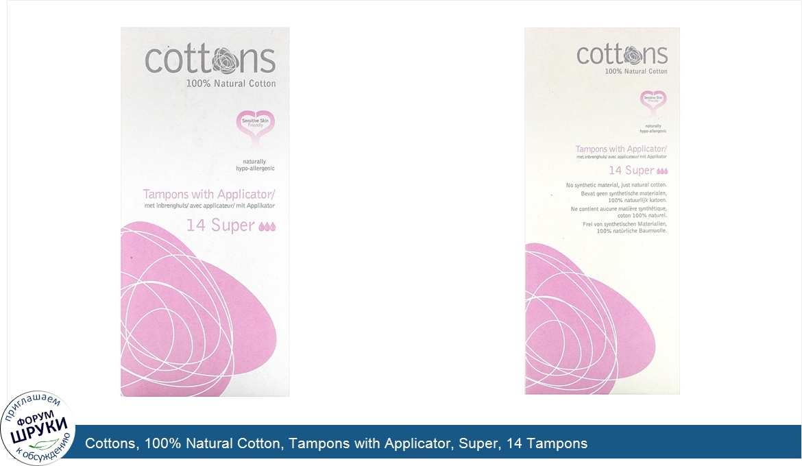 Друзья, если у вас есть отзыв/дополнение/комментарий/вопрос относительно Cottons, 100% Natural Cotton, Tampons with Applicator, Super, 14 Tampons - напишите его ответом в эту тему (это будет полезно всему сообществу в целом и вам в отдельности).