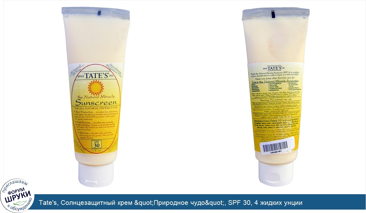 Друзья, если у вас есть отзыв/дополнение/комментарий/вопрос относительно Tate's, Солнцезащитный крем "Природное чудо", SPF 30, 4 жидких унции - напишите его ответом в эту тему (это будет полезно всему сообществу в целом и вам в отдельности).