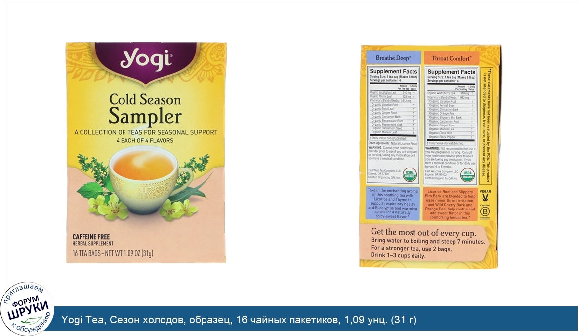 Друзья, если у вас есть отзыв/дополнение/комментарий/вопрос относительно Yogi Tea, Сезон холодов, образец, 16 чайных пакетиков, 1,09 унц. (31 г) - напишите его ответом в эту тему (это будет полезно всему сообществу в целом и вам в отдельности).