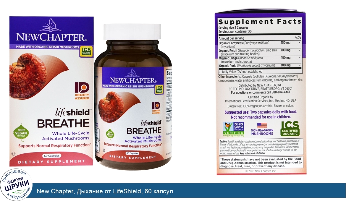 [DESCRIPT]Certified B Corporation. Made with Organic Reishi Mushrooms. ICS - Certified Organic. ID - Identity Assured. 100% Vegan Product. Whole Life-Cycle Activated Mushrooms. Supports Normal Respiratory Function. Dietary Supplement. Certified Organic by International Certification Services. Non GMO Project Verified. 100% USA-Grown Mushrooms. Gluten Free. Holistic. Delivering the Whole Mushroom lifeshield. Fruiting Body. Mycelium Biomass. Spores. Extracellular Compounds. New Chapter. LifeShield. Mushroom formulas deliver organic, tonic mushrooms’ whole protective shield through the combination of mycelium, their extracellular compounds, fruiting bodies and spores. Each stage of a mushroom’s life cycle adds critical nutrients and protection for the mushroom. The combination of these stages creates the activated LifeShield. to promote your health and wellness. Health. Lung Function. - Formulated with select species of tonic mushrooms, including Cordyceps, to promote normal lung respiration and function. Whole Life Cycle. - LifeShield Breathe delivers mushrooms’ whole protective shield by combining mycelium, their extracellular compounds, fruiting bodies and spores. Superior Strains. - Formulated with vigorous mushroom strains grown to their maximum potential. Science and Tradition. - Combines species both revered traditionally and researched extensively for respiratory function, such as organic Reishi and Chaga. Identity Assured. - We use state-of-the-science technologies to match, verify and guaranteed each and every mushroom strain. This includes identification through mushroom DNA testing.[/DESCRIPT]... (описание дополняется)