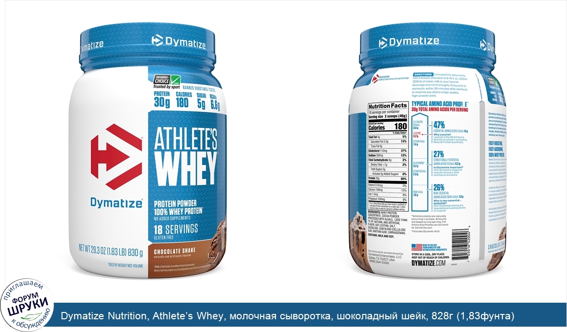 [DESCRIPT]Сертификат Trusted by Sport — Informed-Choice.Org. Сертификат Banned Substance Tested. 30 г протеина | 180 калорий | 4 г сахара | 6,6 г BCAA. Протеиновый порошок, 100% сывороточный протеин*. Не содержит добавок. 18 порций. Без глютена. Натуральные и искусственные ароматизаторы. Perfecting Athletic Nutrition. Типичный аминокислотный состав**. 30 г аминокислот в 1 порции. Незаменимые аминокислоты (EAA) 47% 14,2 г. Аминокислоты с разветвленной цепью (BCAA) в соотношении 2:1:1 — 6,6 г. Лейцин — 3,2 г - Преимущества лейцина. Лейцин — это аминокислота с разветвленной цепью (BCAA), которая непосредственно участвует в активировании синтеза мышечного белка. Другие EAA — 7,5 г. Условно-незаменимые аминокислоты (CEAA) 27% — 8,2 г. Глутамин. †. — 5,2 г - Важен ли глутамин? Несомненно! Глутамин способствует восстановлению мышц после напряженных тренировок. Другие CEAA — 2,9 г. Заменимые аминокислоты (Non-EAA) 26% — 7,8 г. Заменимые кислоты — 7,8 г. Важность заменимых аминокислот. Заменимые аминокислоты являются основным строительным материалом для мышц! Сертификат Trusted by Sport — Informed-Choice.Org. Informed-Choice — это программа обеспечения качества, удостоверяющая, что все пищевые добавки и ингредиенты с логотипом Informed-Choice были протестированы на предмет запрещенных веществ спортивной антидопинговой лабораторией мирового класса LGC. 1 порция содержит. 30 г белков. 180 калорий. 5 г углеводов. 4 г жиров. 4 г сахара. 6,6 г аминокислот с разветвленной цепью (BCAA). 3,2 г лейцина. Сыворотка Dymatize Athlete's Whey — идеальный протеин, который можно употреблять в любое время суток. Независимо от того, готовитесь ли вы к тренировке, тренируетесь, восстанавливаетесь или просто хотите увеличить количество употребляемого протеина, Athlete's Whey может помочь вам в достижении целей. Быстро усваиваемый, 100% сывороточный протеин. Получите максимум удовольствия от тренировок благодаря Athlete's Whey. Каждая порция Athlete's Whey содержит 30 г высококачественного, быстро усваиваемого и усваиваемого сывороточного протеина без каких-либо добавок, чтобы поддерживать даже самые строгие спортивные цели и фитнес-цели. Athlete's Whey разработан собственными учеными, занимающимися исследованиями и разработками, путем тщательного отбора ингредиентов, соответствующих нашим высоким стандартам качества и спецификациям. Все протеиновые порошки Athlete's Whey легко смешиваются, гарантируя вкус и консистенцию мирового класса в каждой порции. Ароматизаторы Athlete's Whey разрабатываются нашими специалистами, поэтому они восхитительны. Попробуйте и насладитесь коктейлем Athlete's Whey. Воспринимайте это как разумную награду за ваш упорный труд и преданность делу. Настоящее научное качество. Протеин Dymatize создан на основе последних достижений науки и проходит испытания в университетских исследованиях, а также в элитных профессиональных тренировочных учреждениях. Протеиновые порошки Dymatize всегда производятся на предприятиях, имеющих регистрацию GMP, что означает, что все ингредиенты и конечные продукты проходят строгие испытания и проверку на чистоту и безопасность. Отсутствие запрещенных веществ для спортсменов подтверждено Informed-Choice. Этика Dymatize Protein. 100% заявленного в порции протеина получено из высококачественных, неповрежденных белков. Не содержит аминокислот свободной формы. * 100% протеин из концентрата сывороточного белка. ** Все аминокислоты естественным образом содержатся в белках. Количество указано из расчета на одну по