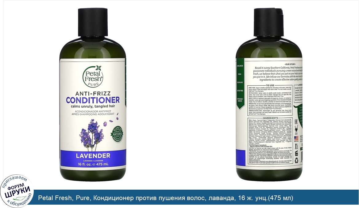 [DESCRIPT]Calms Unruly, Tangled Hair. Made With Blend of Natural Botanicals. pH Balanced. Vegan. Color-Safe. Gluten-Free. Sustainably Sourced. Cruelty Free. We Love Animals. Our Story. Based in sunny Southern California, Petal Fresh was started by a group of passionate individuals pursing a more natural and healthy lifestyle. At Petal Fresh, we believe that what you put on your body is just as important as what you put in it. We infuse our formulas with the most natural, Certified Organic ingredients to create effective salon quality products, naturally. Lavender Conditioner. Combat frizz naturally with Petal Fresh® Pure Lavender Conditioner. The frizz-eliminating blend of Certified Organic Lavender and 8 premium Botanical extracts provides intense moisture and tames coarse textures, leaving hair ultra-polished and silky smooth. The use of Lavender in aromatherapy and beauty dates back thousands of years. Renowned for its abilities to calm and relax, Lavender is not only wonderful for soothing the mind, but also ideal for taming frizz by moisturizing hair.[/DESCRIPT]... (описание дополняется)