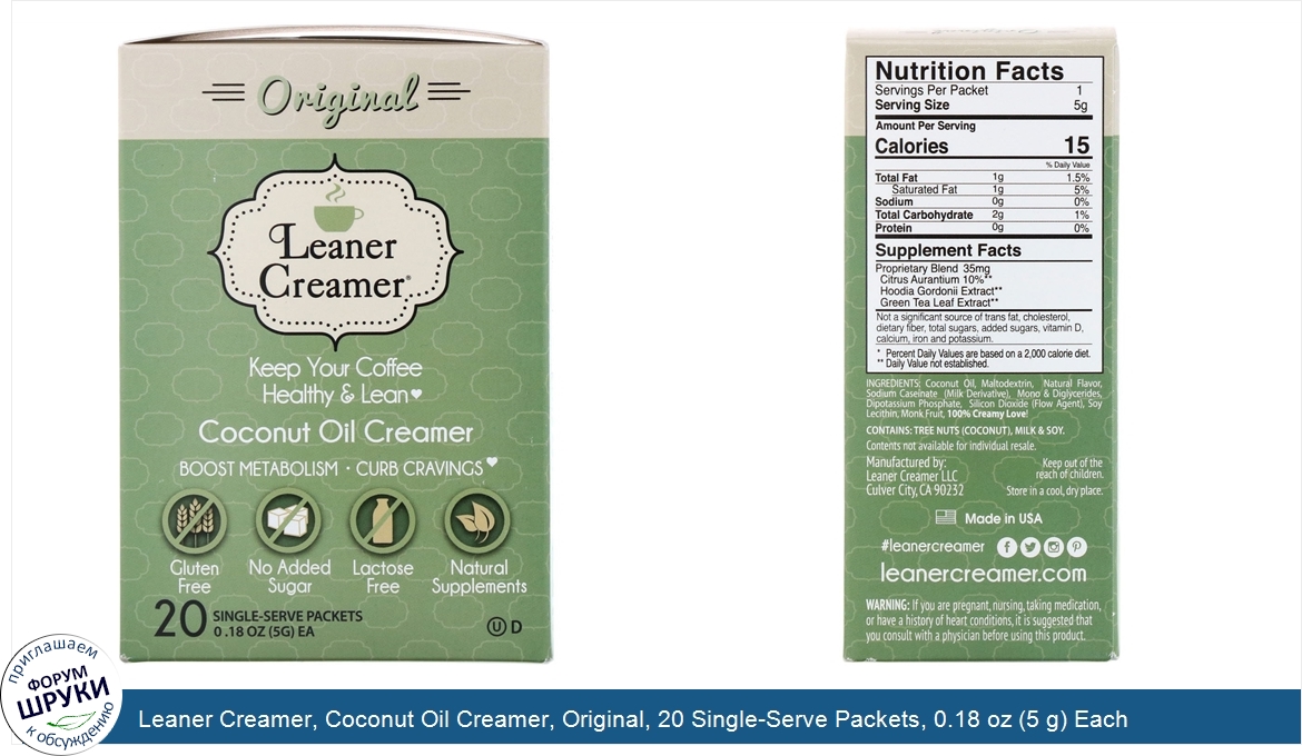 Друзья, если у вас есть отзыв/дополнение/комментарий/вопрос относительно Leaner Creamer, Coconut Oil Creamer, Original, 20 Single-Serve Packets, 0.18 oz (5 g) Each - напишите его ответом в эту тему (это будет полезно всему сообществу в целом и вам в отдельности).