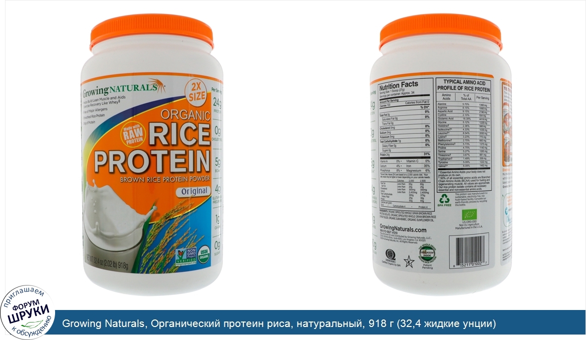 Друзья, если у вас есть отзыв/дополнение/комментарий/вопрос относительно Growing Naturals, Органический протеин риса, натуральный, 918 г (32,4 жидкие унции) - напишите его ответом в эту тему (это будет полезно всему сообществу в целом и вам в отдельности).